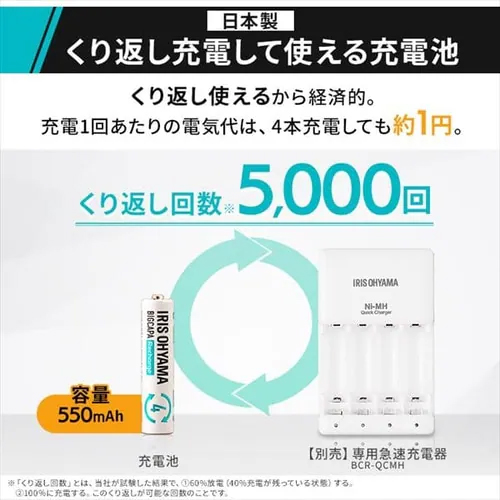 | くり返し充電して使える“日本製”充電池 くり返し使えるから経済的。 充電1回あたりの電気代は、4本充電しても約0.4円。 |