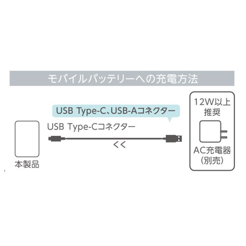 | 薄くて軽く、持ち運びに最適な、12W出力、容量5000mAhのコンパクトなモバイルバッテリーです。 | |||