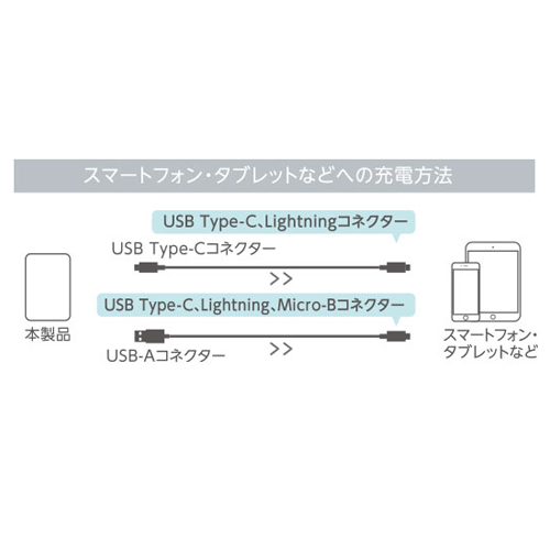 | 本製品(バッテリー容量5000mAh)で、1800mAhのスマートフォンを約1.6回、3000mAhのスマートフォンを約0.9回充電可能です。 ※満充電した本製品で電源オフの状態のスマートフォンを充電する際の目安回数です。充電中に電源を入れたり、機器を使用したりしている場合は記載の数値まで充電できない場合があります。 |