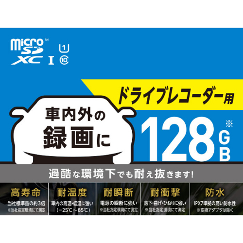 | ドライブレコーダーに最適な、高耐久モデルのmicroSDHCメモリカードです。 ※他に、防犯/監視カメラ・ネットワークカメラなど書込み回数が多い用途にも適しています。 |