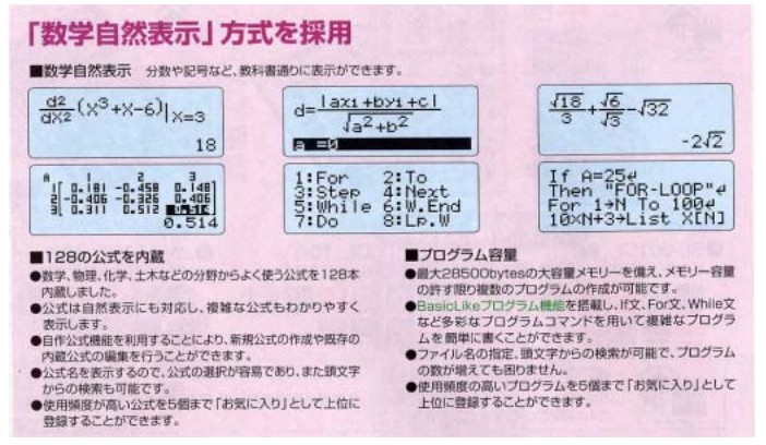 | 応用計算 | マルチステートメント機能 連続演算機能 リプレイ機能 マルチリプレイ機能 カルク機能 ソルブ機能 内蔵公式128本 |
