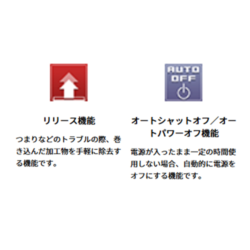 ・リリース機能付き つまりなどのトラブルの際、巻き込んだ加工物を手軽に除去する機能です。 |