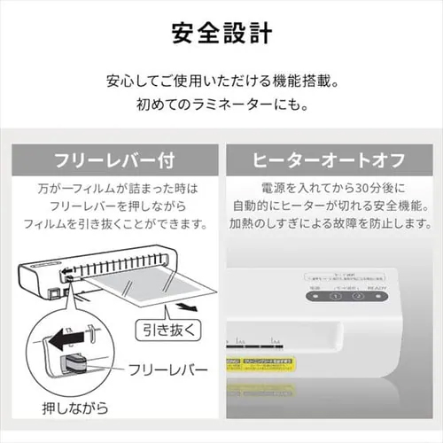 | ウォームアップ時間約90秒、ストレスなしですぐに使えるラミネーターです。 | |||