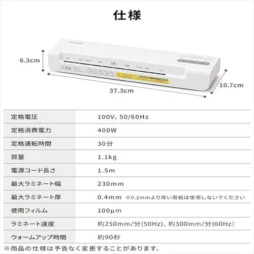| 最大ラミネート厚 | 0.4mm | ウォームアップ時間 | 約1分30秒 |