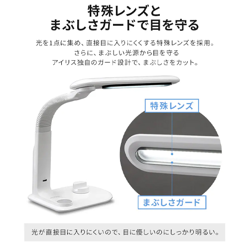 | 【特殊レンズとまぶしさガードで目を守る】 光を1点に集め、直接目に入りにくくする特殊レンズを採用。 更に、まぶしい光源から目を守るアイリス独自のガード設計で、まぶしさをカット。 |