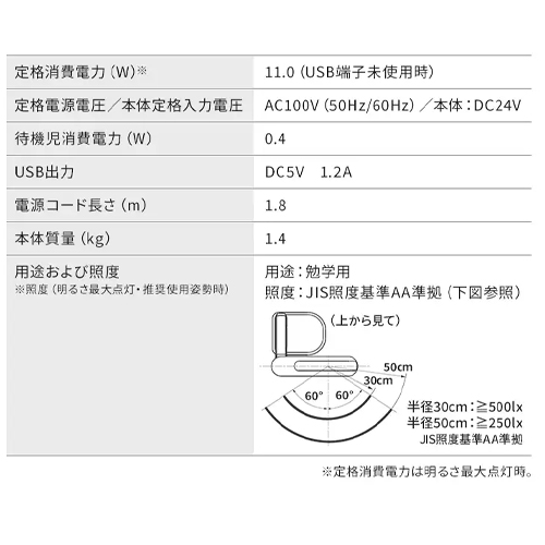 | 定格消費電力 | 電源アダプター含む:11.0W ランプ本体のみ:9.2W |