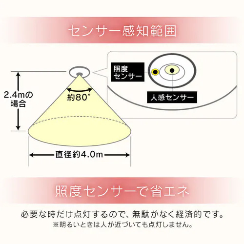 | 【人感センサー付き】 人を感知して自動でON/OFF。 離れると約90秒後に消灯。消し忘れの心配なし! |