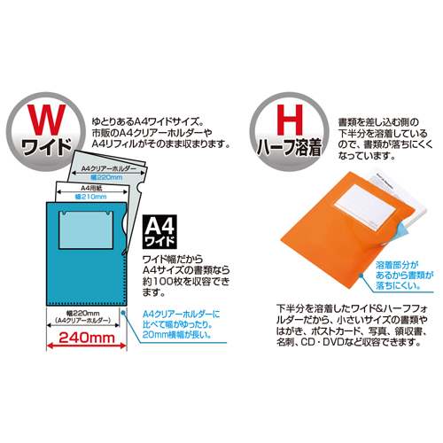 A4クリヤーフォルダーが収納できるワイド幅、中身が落ちにくいハーフ溶着仕様