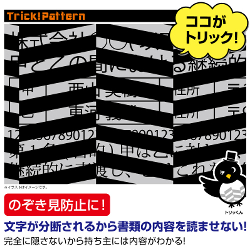 | 目の錯覚を利用した「トリック!パターン」によって、挟んだ書類の文字が分断されたように見えます。 | |||