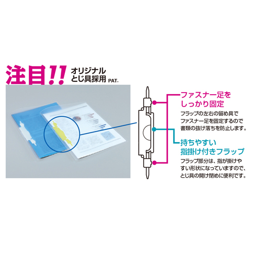 | フラップの左右にある留め具がファスナー足をしっかり固定するとじ具なので書類の抜け落ちがありません。 | |||
