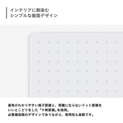 | 盤面に、直角がわかりやすい格子罫線と邪魔にならないドット罫線をいいとこどりをした「十字罫線(1cm間隔)」を採用のため、水平・垂直の位置が取りやすく実用性も抜群です。 | |||