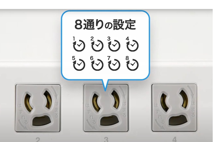 | 差込口ごとにタイマー設定が可能なタイマーパネル付きの電源タップ。 | |||