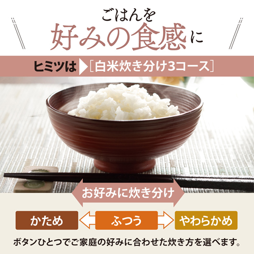 | 炊き方が選べる「白米炊き分け3コース」 ご家庭のお好みにあわせ、ふつう・やわらかめ・かためと炊き方が選べます。 |