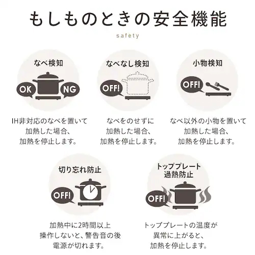 | タイマー | 1分~9時間59分 | 安全機能 | なべ検知機能/小物検知機能 内部回路過熱防止機能 トッププレート過熱防止機能 揚げ物鍋そり検知機能 切り忘れ防止機能 |