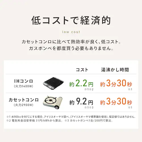 | カセットコンロに比べて発熱率が良く、低コスト。ガスボンベを買う必要もありません。 | |||