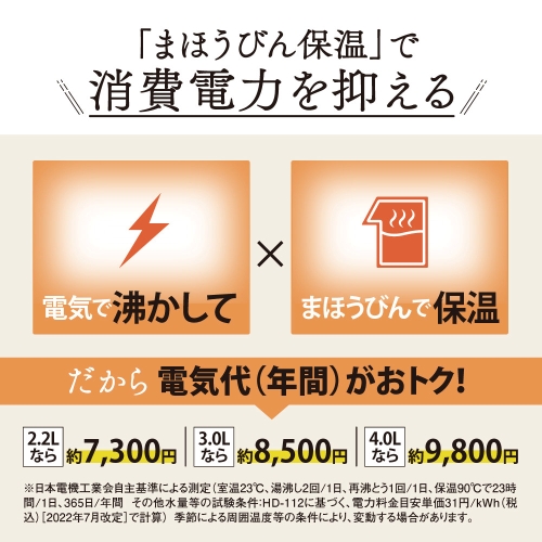 | 湯沸かし時間、消費電力量、蒸気を抑える「沸とうセーブ」(選択式) 90℃・80℃・70℃保温設定時に選択可能 |