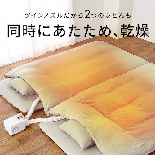| 温風でふとんをあたため、湿気とカラリととばす「カラリエ」。 ツインノズルだから2つの布団も一気に同時あたため&乾燥! |