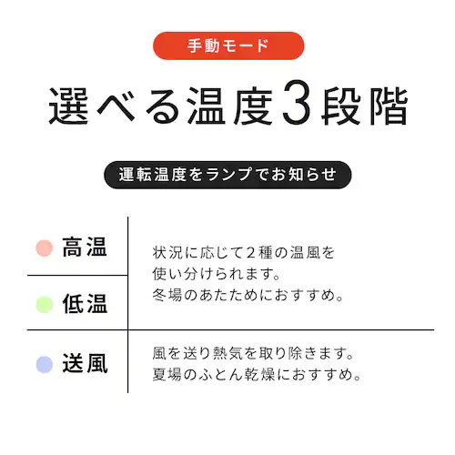| 風を3段階使い分ける。 高温・低温:2種類の温風で、好みや状況に応じて使い分けられます。 送風:風を送り熱気を取り除きます。 |