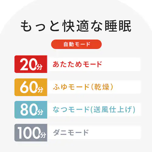 | 1年中大活躍、自動乾燥モード4種。 あたためモード、冬モード、夏モード、ダニモードでオールシーズン快適な布団に。 |