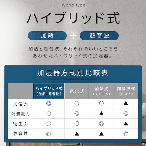 | 超音波式と加熱式、それぞれのいいところをあわせたハイブリッド式の加湿器です。 | |||