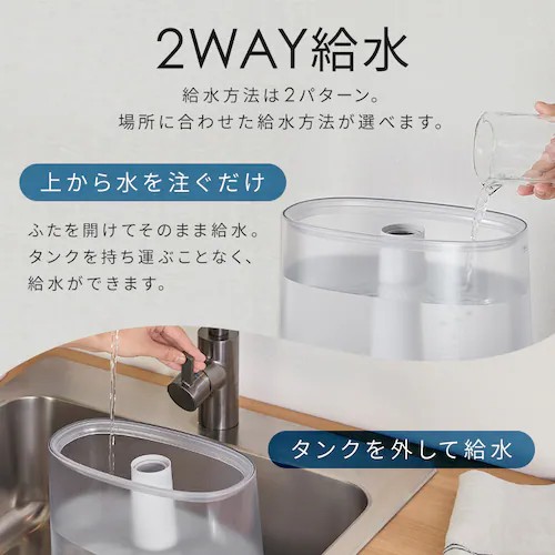 | 給水方法は2パターン。場所に合わせた給水方法が選べます。 [上から水を注ぐだけ]ふたを開けてそのまま給水。タンクを持ち運ぶことなく、給水ができます。 [タンクを外して給水]かんたんに取り外せるので、タンク内のお手入れもラクラク。 |