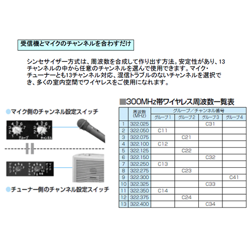 マイク・チューナーとも13チャンネル対応。 混信トラブルのないチャンネルを選択でき、多くの室内空間でワイヤレスを使用可能です。 |