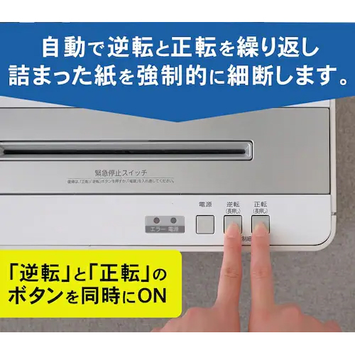 | オートリバース機能で細断能力以上の紙を投入すると自動で逆転し運転を停止して紙詰まりを防ぎます | |||