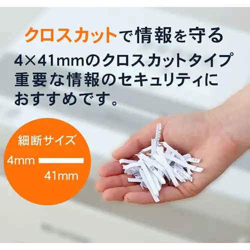 | 最大細断枚数 | 一度にA4コピー用紙を最大18枚細断 | 細断形状 | 約4×41mm(クロスカット) |