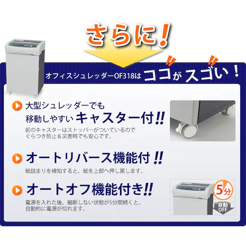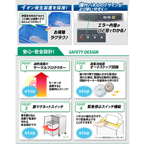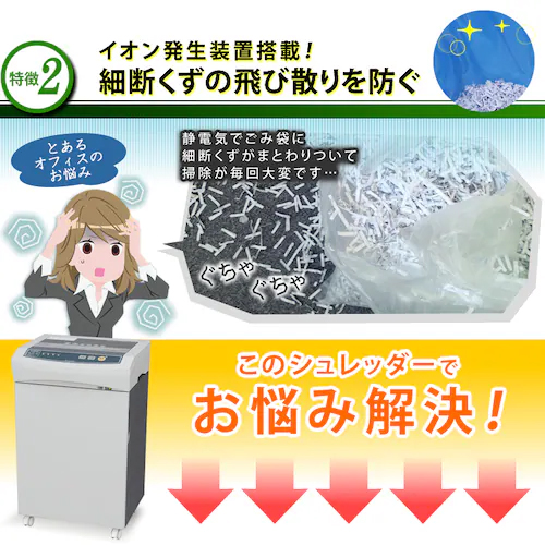 | キャスター | 自在×2、自在(ストッパー付)×2 | 機能 | イオン発生装置付 :静電気により、細断くずがダストボックスに吸着したり舞い上がったりするのを低減 オートリバース機能(自動逆転)付 :紙詰まりを感知すると、カッターが自動的に約3秒間逆転し、紙を上部に押し戻します。 オートオフ機能付 :電源を入れた後、細断しない状態が5分間続くと、自動的に電源が切れます。 |