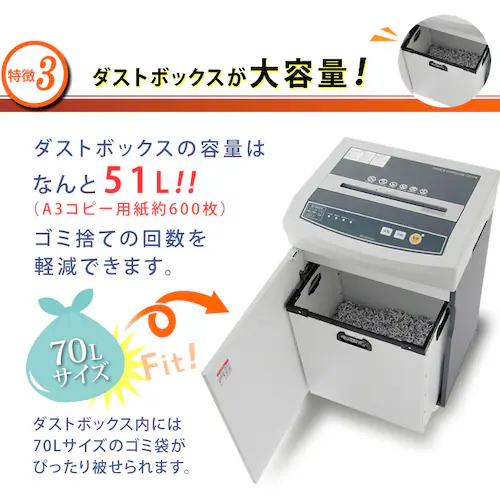 | ダストボックス容量 | 約51L(A4用紙約1200枚) | 細断形状 | 約3.9×28mmのクロスカット |