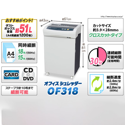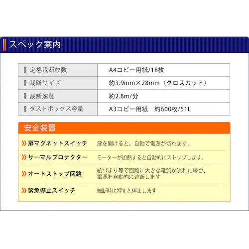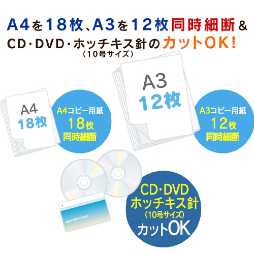 | 最大細断枚数 | A4コピー用紙:18枚(50Hz)/15枚(60Hz) (※縦入れ時はA3コピー用紙12枚(50Hz)/10枚(60Hz))、 CD・DVD:1枚、カード:1枚、 ステープラの針:10号まで |