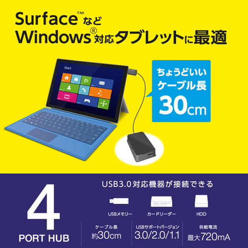 | Surface(TM)やWindows(R)タブレットに接続することで、USB3.0に対応したUSBメモリやカードリーダー、HDDなどが使用できる4ポートUSB3.0ハブです。 | |||