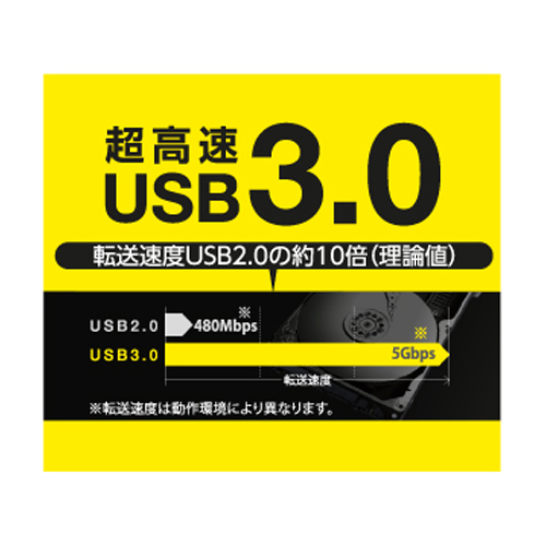 | 転送速度5Gbpsと従来のUSB2.0の約10倍の転送速度(理論値)を実現するUSB3.0に対応しています。 | |||