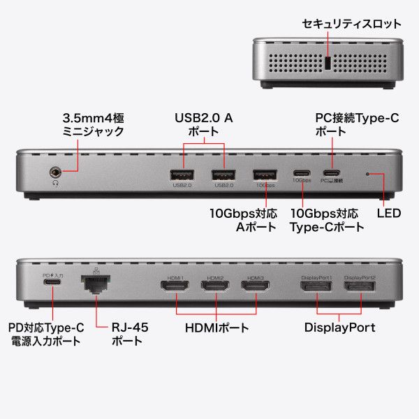 | 対応画面数 | 4K/60Hz×3画面出力 | 電源 | バスパワー/セルフパワー(電源接続時) |