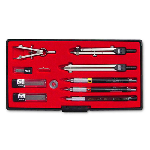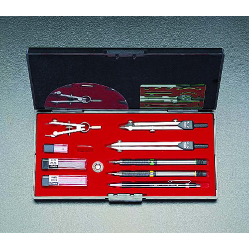 | ケースサイズ | 外寸:278(W)×24(D)×143(H)mm | セット内容 | ●穂替コンパス(小型 鉛筆)長さ:83mm・適正使用:半径3~5mm・特殊合金圧延材製 ●デバイダー(大型)長さ:150mm・適正使用半径:0~150mm・特殊合金圧延材製 ●小型スプリングコンパス(鉛筆)芯入り・長さ:130mm・適正使用半径15~150mm・特殊合金圧延材製 ●ドローイングシャープ(0.5mm、0.3mm) ●ドローイングホルダードロップS型 (2.0mm) 長さ:140mm ●ホンセンター ●ドライバー ●替芯(2.0mm、0.5mm、0.3mm) ●分度器12cm 厚さ:0.5mm・硬質ビニール製 ●字消板 ●拭布 |