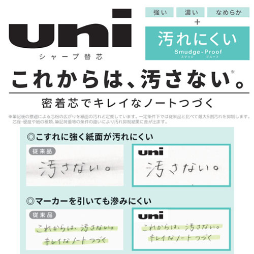 | くっきり濃いのに汚れにくい 独自成分配合により芯粉が紙面に高密着。くっきり濃い文字を書くことができ、かつ、こすれに強いため筆記後のノートをキレイに保ちます。 |
