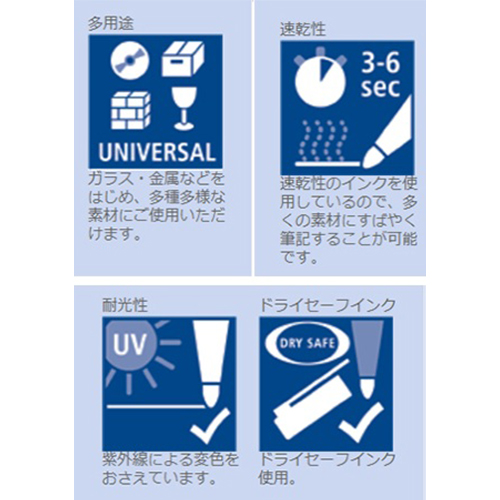 | 速乾性のインクを使用。多くの素材に素早く筆記することが可能です。 | |||
