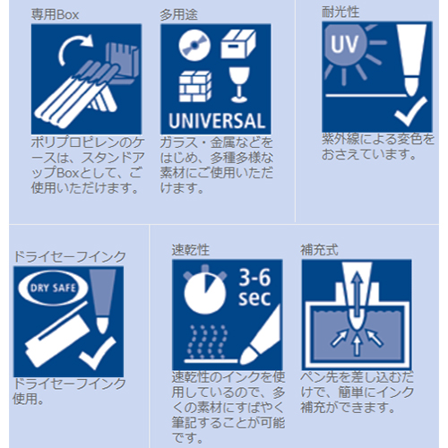 | 速乾性のインクを使用。多くの素材に素早く筆記することが可能です。 | |||