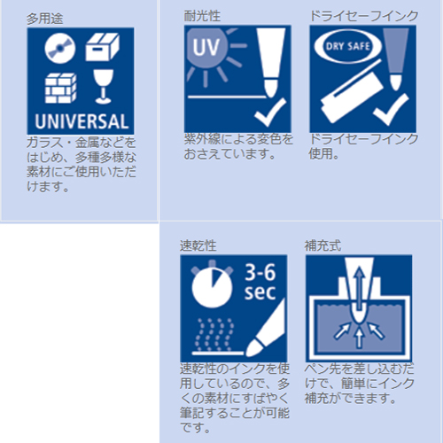 | 速乾性のインクを使用。多くの素材に素早く筆記することが可能です。 | |||