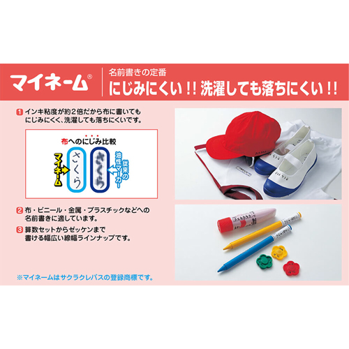 | にじみにくく、洗濯に強いマイネームのインキを使用したマーカーです。 | |||