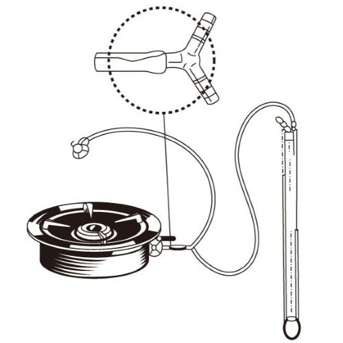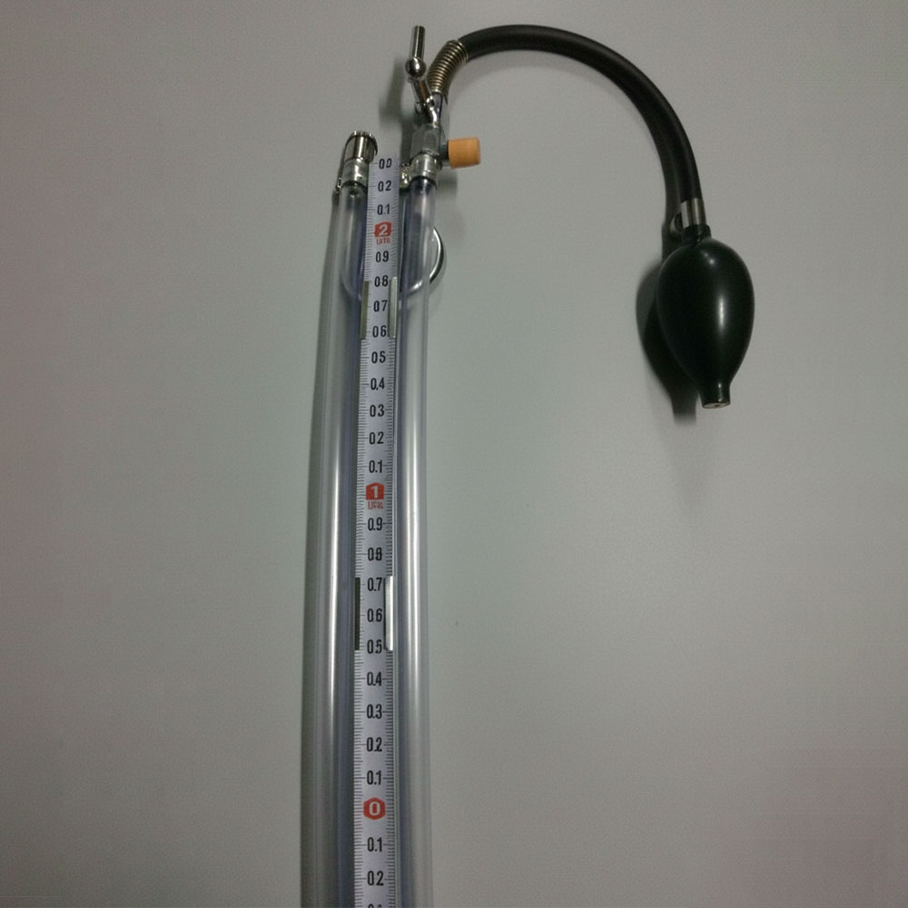 | 使用法(サブ画像参照) ①U字管のAの栓を外し、水をスケールの-0-線まで入れます。 ・U字管に入れる水は、なるべく蒸留水を使います。 ②スケール(目盛)-0-の線と水面が一致しない場合は、スケールを上下に移動して正確に合わせます。 ③Aの栓を締め、ゴム管をB端に取り付けゴム管の末端を検査箇所に接続します。 ④Aの栓を徐々にゆるめれば、B端より入って来る圧力によりB側の水柱は降下し、A側の水柱は上昇し4図のように圧力を表示します。 |