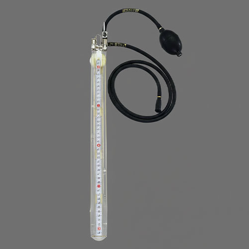| 圧力の読み方 ・スケールの-0-より上昇した側のミリ数と降下した側のミリ数とを加え合わせればその圧力(… mm水柱)が読み取れます。 ・例えば上昇した側は零点より138mm高く、他の側は142mmの低さとします。その圧力は 両方を加え合わせて280mm水柱となります。 (零点より上昇した水面までの高さ)+(降下した水面より零点までの高さ)= Xmm水柱(求める圧力) |