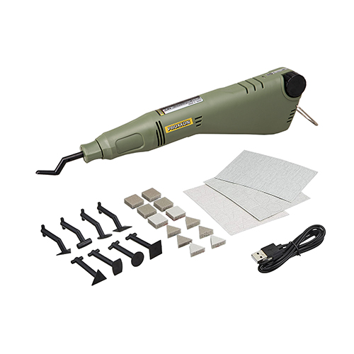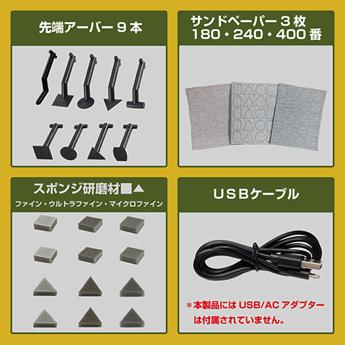 | 付属品 | ・専用アーバー9種 各1本 ・ヤスリペーパー180番、240番、400番 各1シート (各1シートに4種類の形状が各5枚) ・研磨スポンジ ・ファイン、ウルトラファイン、マイクロファイン 2形状 各2枚 ・充電用USBケーブル(Type-A⇔Micro Type-B) |