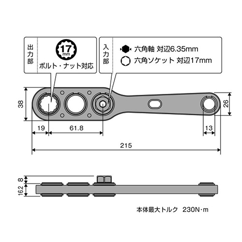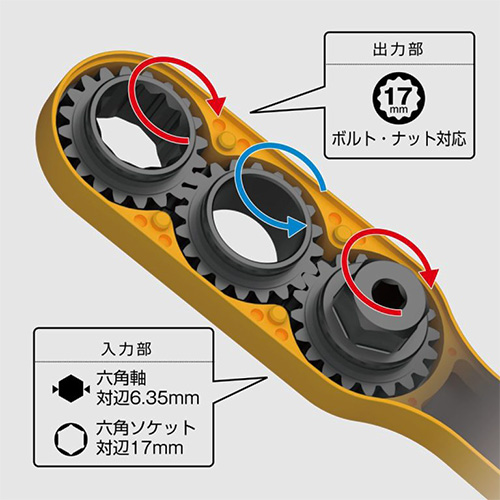 | 用途 | 電気設備の架台、ダクトレール、単管パイプ周りのボルト回し | 仕様 | 入力部:17mm六角、6.35mm六角 出力部:17mm六角(二重六角) 40V対応(18Vにも対応) |