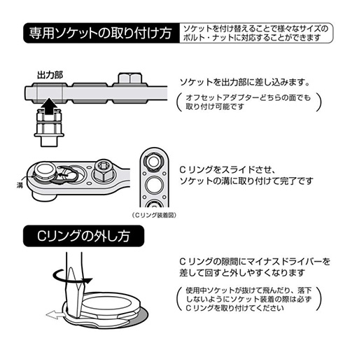 | セット内容 | オフセットアダプター(H17mm対応) 専用ソケット:H8・10・12・13・14・17・19・21mm 止め輪付ビット ソケットCリング(2ヶ) 収納ケース |