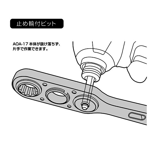 | オフセットアダプター本体が抜け落ちず、片手で作業ができる止め輪付ビットを付属 | |||