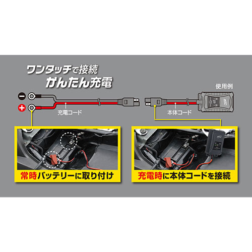 | バッテリーターミナルを外さずに充電できます。(※原付などのカプラタイプを除く) | |||