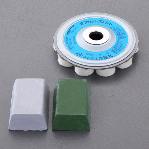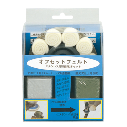 | <セット内容> | ・オフセットフェルト ・光沢仕上げ用バフ研磨剤(グレー) ・超光沢仕上げ用バフ研磨剤(緑) 各1個 |