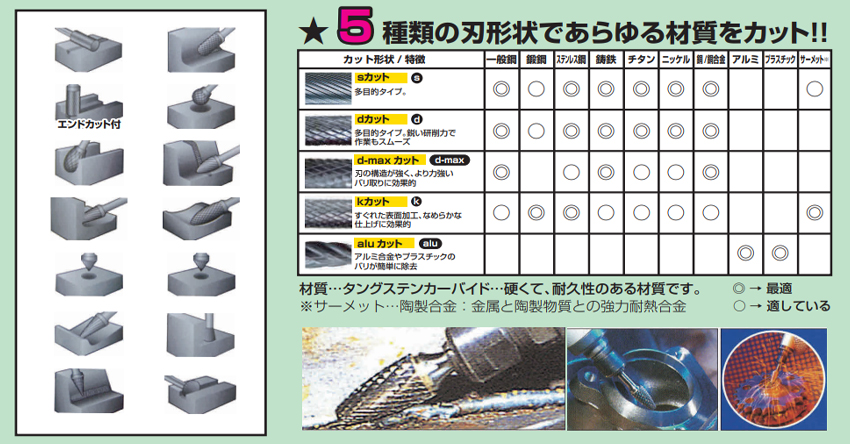 | 適合材質:ステンレス鋼、鍛鋼、サーメット、一般鋼、鋳鉄、ニッケル、銅、銅合金、チタン | |||
