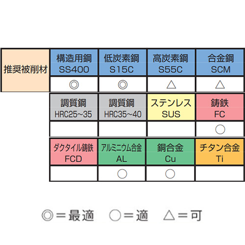 | 表面処理 | 酸化処理(ホモ処理) | 対応被削材 | 構造鋼、低炭素鋼、鋳鉄、アルミニウム合金、銅合金 |